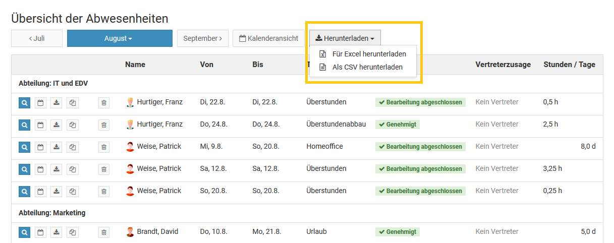 Screenshot: Abwesenheitseinträge in der Listenansicht herunterladen