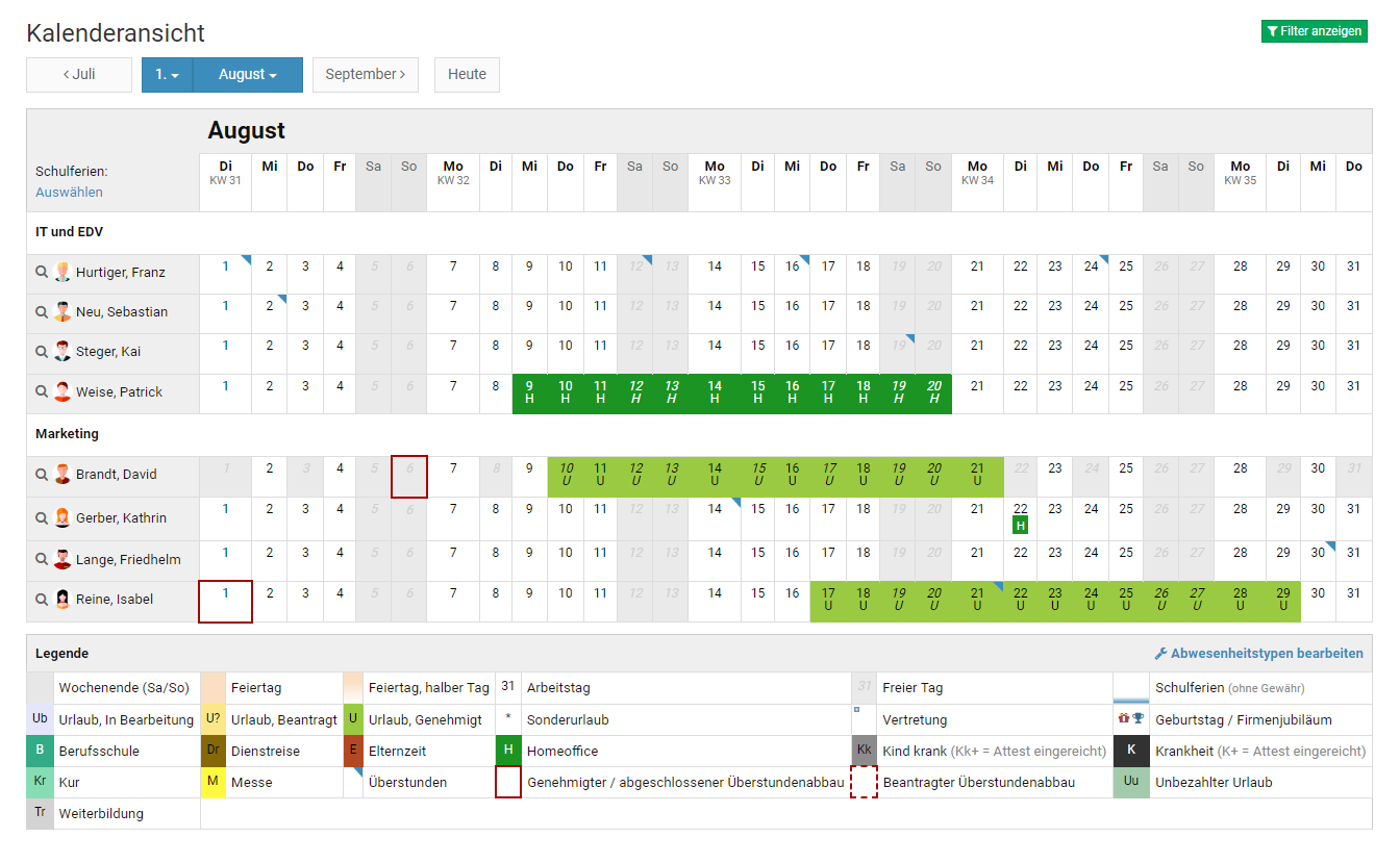 In der Kalenderansicht über die Kollegen (Mitarbeiter-Nutzer) oder das eigene Team (Vorgesetzte und Admins) werden die Mitarbeiter alphabetisch sortiert angezeigt.