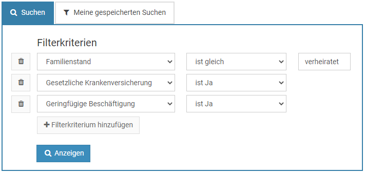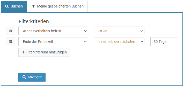 Wenn notwendig, erstellen Sie mehrere Filterkriterien. Die Filterkriterien werden Und-verknüpft, das heißt, dass beim Ausführen der Auswertung nur diejenigen Personalakten und Mitarbeiter gefunden werden, bei denen