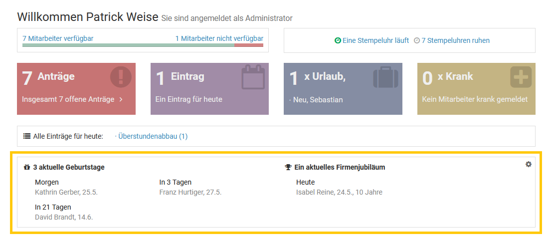 Im Dashboard (Startseite nach der Anmeldung im Timebutler) erhalten Admins und Vorgesetzte die anstehenden Geburtstage und Firmenjubiläen der Mitarbeiter angezeigt, auf die sie Sichtrechte haben.