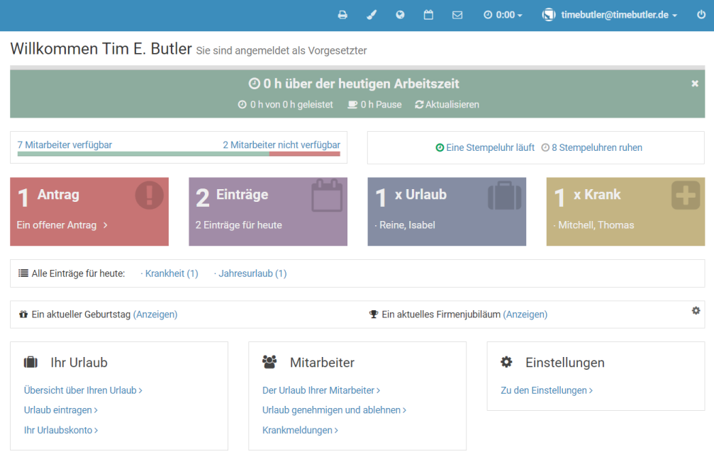 Direkt nach der Anmeldung an Ihrem Timebutler Nutzerkonto gelangen Sie zu dem Dashboard - Ihrem Cockpit mit der übersichtlichen Darstellung aller relevanten Informationen auf einer Seite.