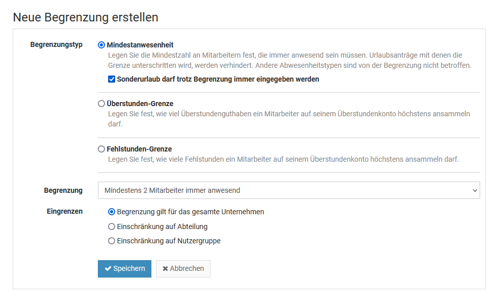 Mit den Begrenzungen kann sichergestellt werden, dass eine bestimmte Mindestanzahl Mitarbeiter verfügbar ist und nicht zu viele Mitarbeiter aus einer Abteilung oder