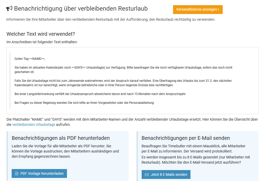 Im Timebutler gibt es zwei Möglichkeiten, die Mitarbeiter mit wenigen Mausklicks individuell über den verbleibenden Resturlaub zu benachrichtigen: