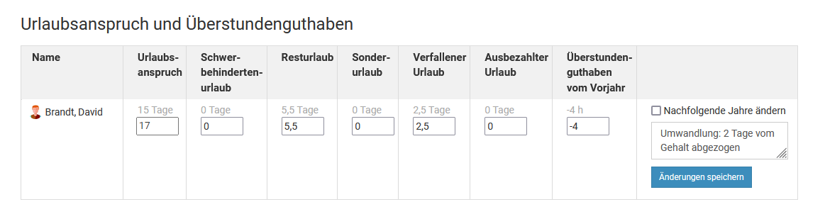 Beispiel:Für Mitarbeiter Huber wurde der Gegenwert von 2 Urlaubstagen bei der Gehaltszahlung abgezogen. In der Eingabemaske für den Urlaubsanspruch hat Hr. Huber 25 Tage Urlaubsanspruch stehen. Der Admin ändert also die 25 in eine 27 und speichert die Änderung.