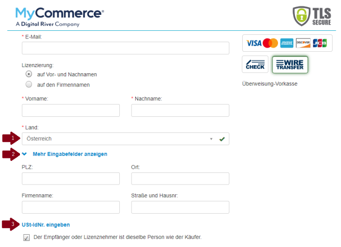 Bei Bestellungen von außerhalb Deutschlands wird die Bestellung aus buchhalterischen Gründen von unserem Partner MyCommerce abgewickelt. MyCommerce ist ein internationaler Zahlungsdienstleister, der täglich tausende Zahlungen weltweit verarbeitet. Sie werden dann im Verlauf des Bestellvorgangs zu dem Bestellformular von MyCommerce weitergeleitet. Auf dem Bestellformular geben Sie die Umsatzsteuer-ID ein, indem Sie folgende Optionen anklicken: