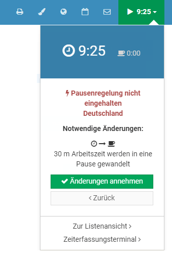 Meldung in der Stempeluhr, wenn die Vorgaben aus der Pausenregelung nicht eingehalten wurden: