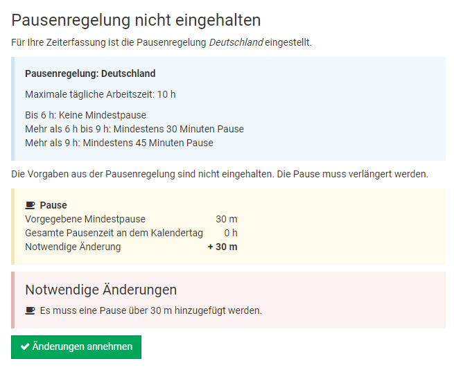 Meldung beim Speichern eines Arbeitszeiteintrages, wenn die Vorgaben aus der Pausenregelung nicht eingehalten wurden: