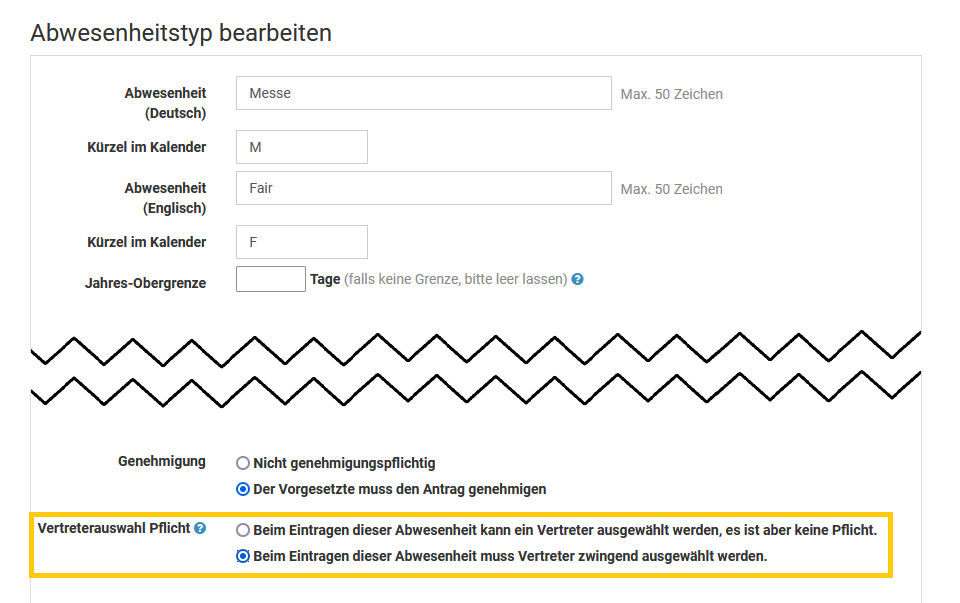Ein Admin kann für jeden Abwesenheitstyp (Urlaub, Homeoffice, Dienstreise, ...) einstellen, ob dieser